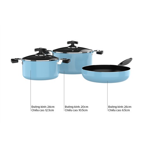 Bộ sản phẩm gồm 2 nồi với đường kính 20 và 24 cm và 1 chảo 26 cm phù hợp với nhu cầu nấu nướng của mọi gia đình.