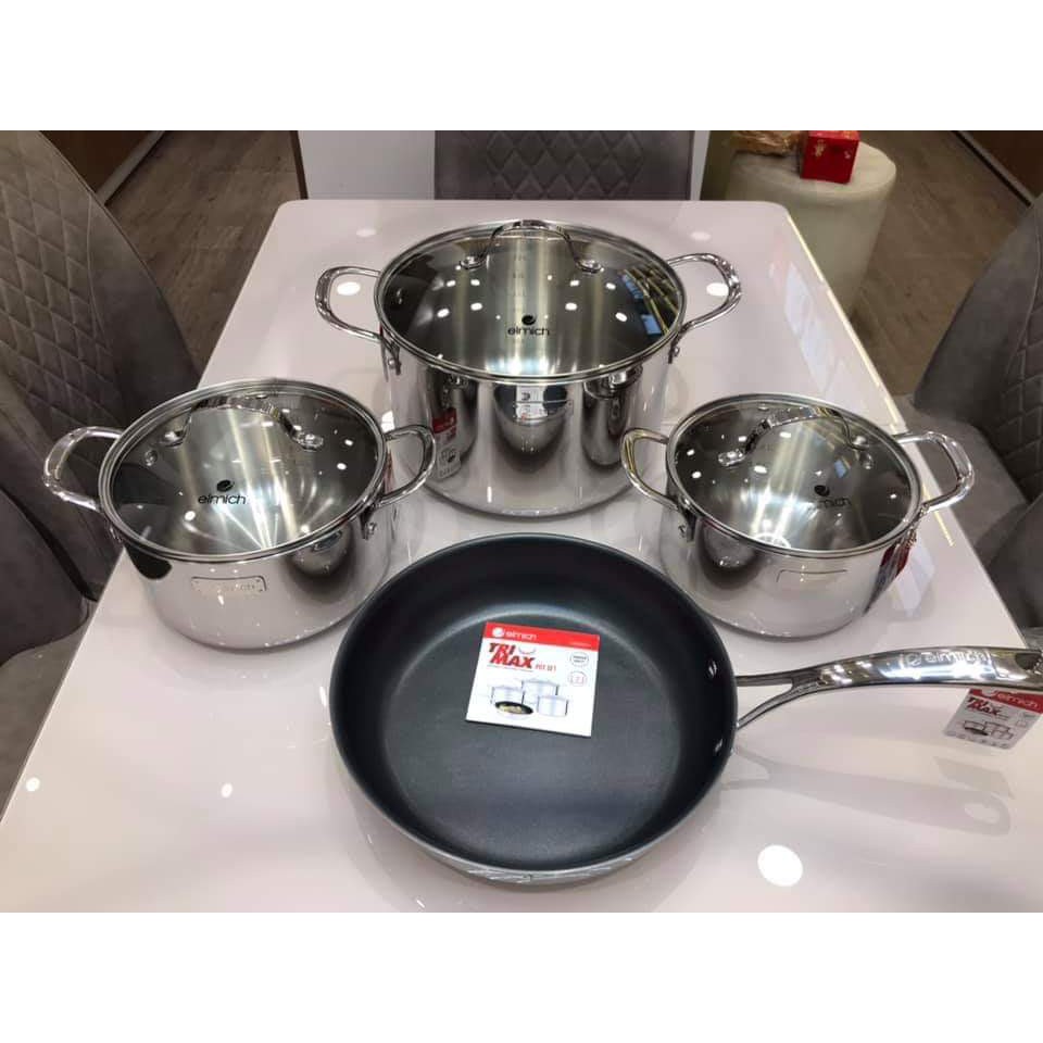 BỘ NỒI CHẢO ELMICH 3742 INOX CAO CẤP 3 LỚP ĐÁY LIỀN TRI-MAX 4 CHIẾC SIZE 18CM, 20CM, 26CM VÀ CHẢO 26CM