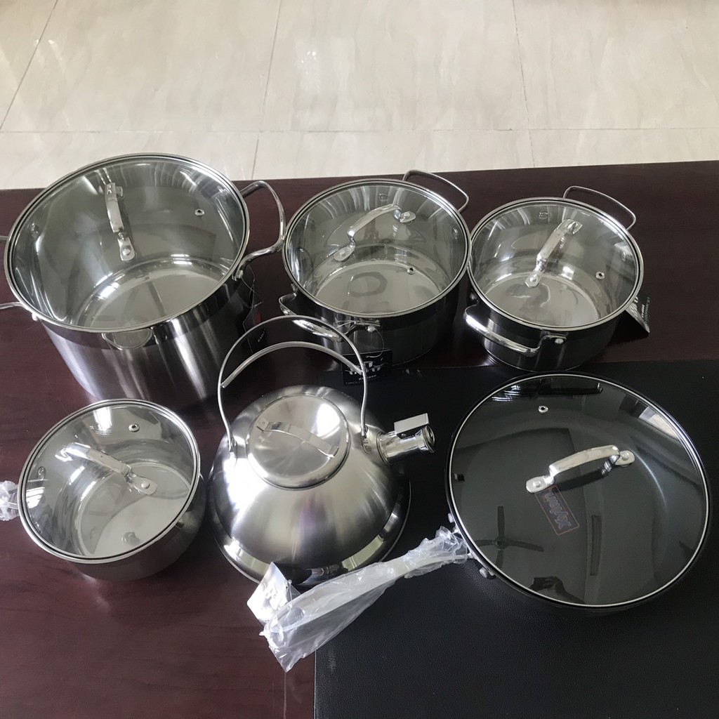 Bộ nồi gồm 6 cái và 12 chi tiết với 5 lớp đáyNắp kính chịu nhiệt.