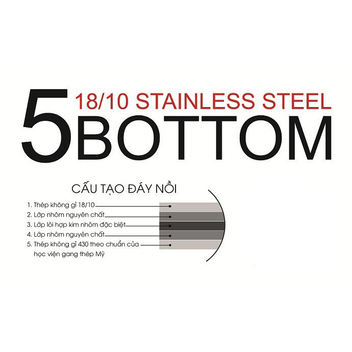 - Lớp ngoài cùng là inox 430 hay thép không gỉ 430 theo chuẩn của học viện gang thép Mỹ có đặc tính dẫn từ giúp cho nồi có thể sử dụng trên tất cả các loại bếp như bếp từ, bếp ga, bếp hồng ngoại…