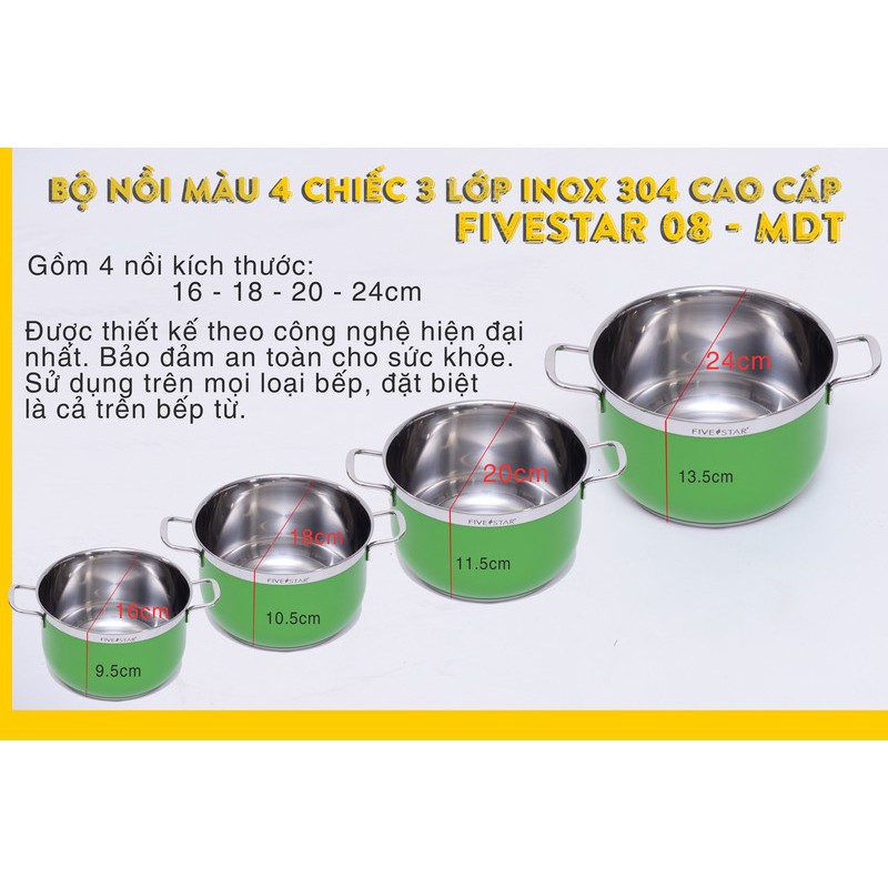 Nồi inox Fivestar 4 chiếc 3 ĐÁY INOX 304- Bộ nồi Inox cao cấp 4 chiếc
