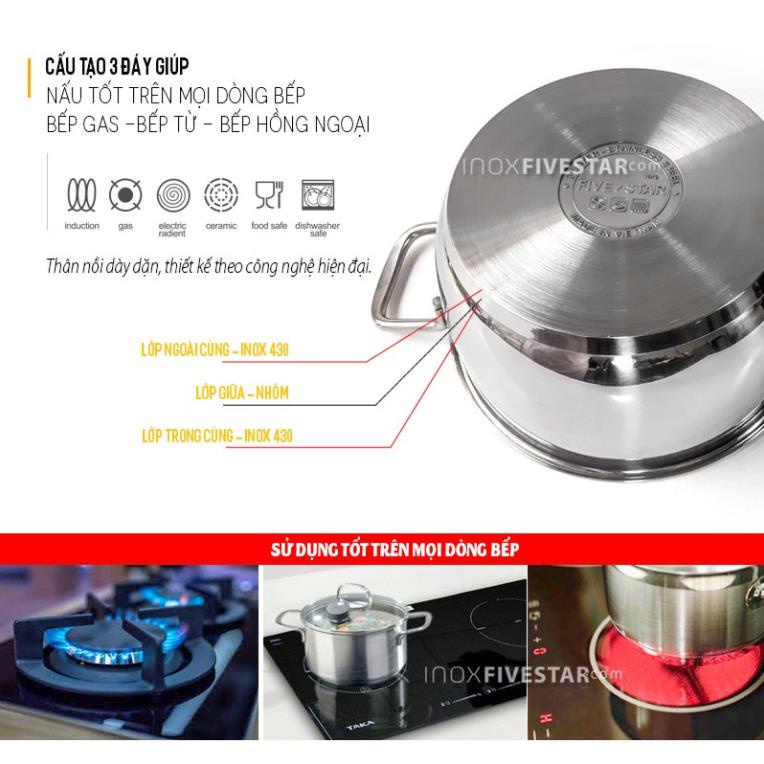 Bộ nồi Inox 3 đáy Fivestar Chính hãng Tân Hợp Thành dùng bếp từ, bảo hành 5 nămBộ nồi 5 món, quai đủa, 3 đáy, kiểu dáng châu Âu sang trọng, được làm bằng inox cao cấp từ Nhật Bản và Hàn Quốc. Kết cấu đáy nồi gồm 3 lớp: inox-nhôm-inox đảm bảo sự truyền nhiệt đều và giử nhiệt lâu nhằm tiết kiệm nhiên liệu, không làm thức ăn bị cháy sém hoặc chín không đều. Bộ nồi dùng được cho bếp than, bếp điện, bếp gas và bếp từ. Bộ nồi phù hợp với mọi gia đình.