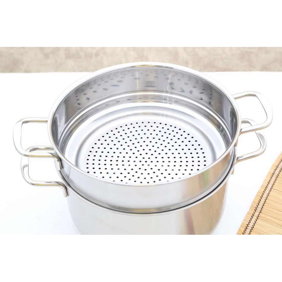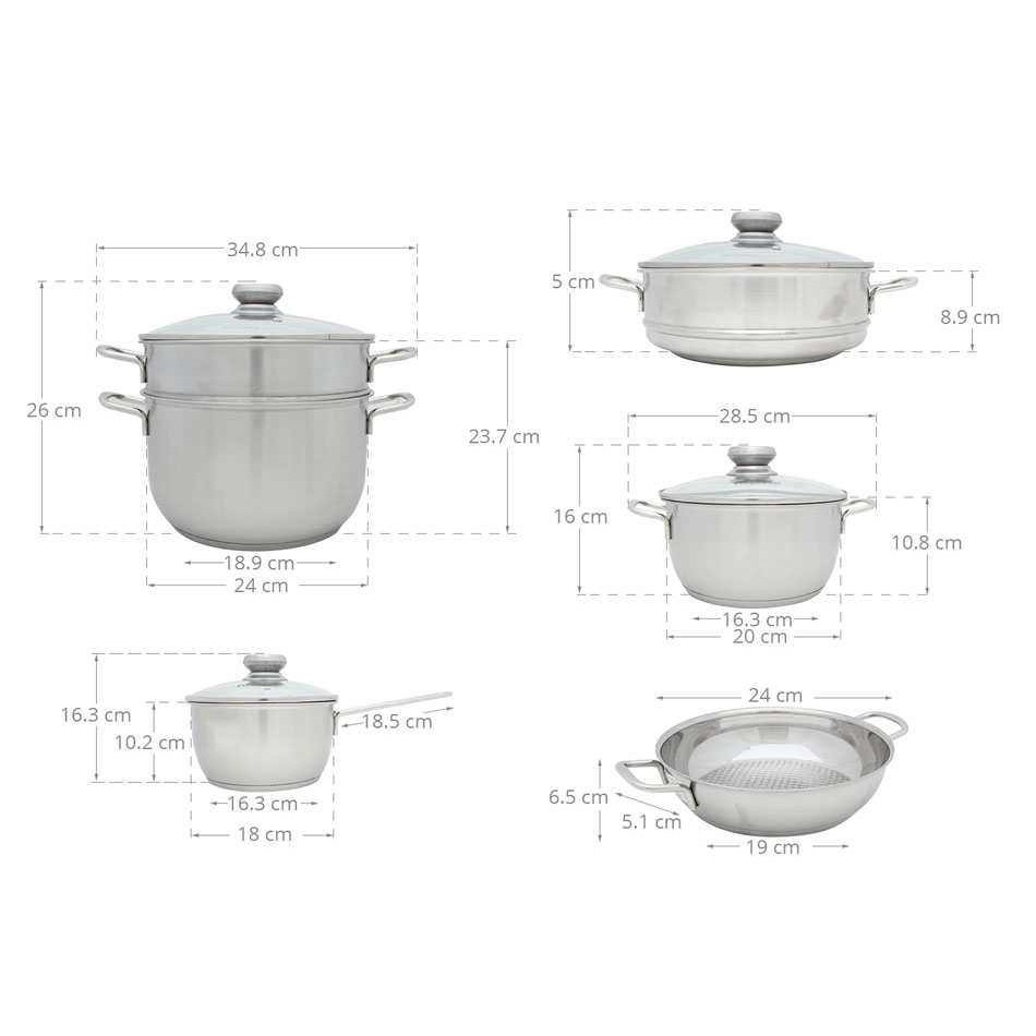 Bộ nồi 5 món, quai đủa, 3 đáy, kiểu dáng châu Âu sang trọng, được làm bằng inox cao cấp từ Nhật Bản và Hàn Quốc. Kết cấu đáy nồi gồm 3 lớp: inox-nhôm-inox đảm bảo sự truyền nhiệt đều và giử nhiệt lâu nhằm tiết kiệm nhiên liệu, không làm thức ăn bị cháy sém hoặc chín không đều. Bộ nồi dùng được cho bếp than, bếp điện, bếp gas và bếp từ. Bộ nồi phù hợp với mọi gia đình.