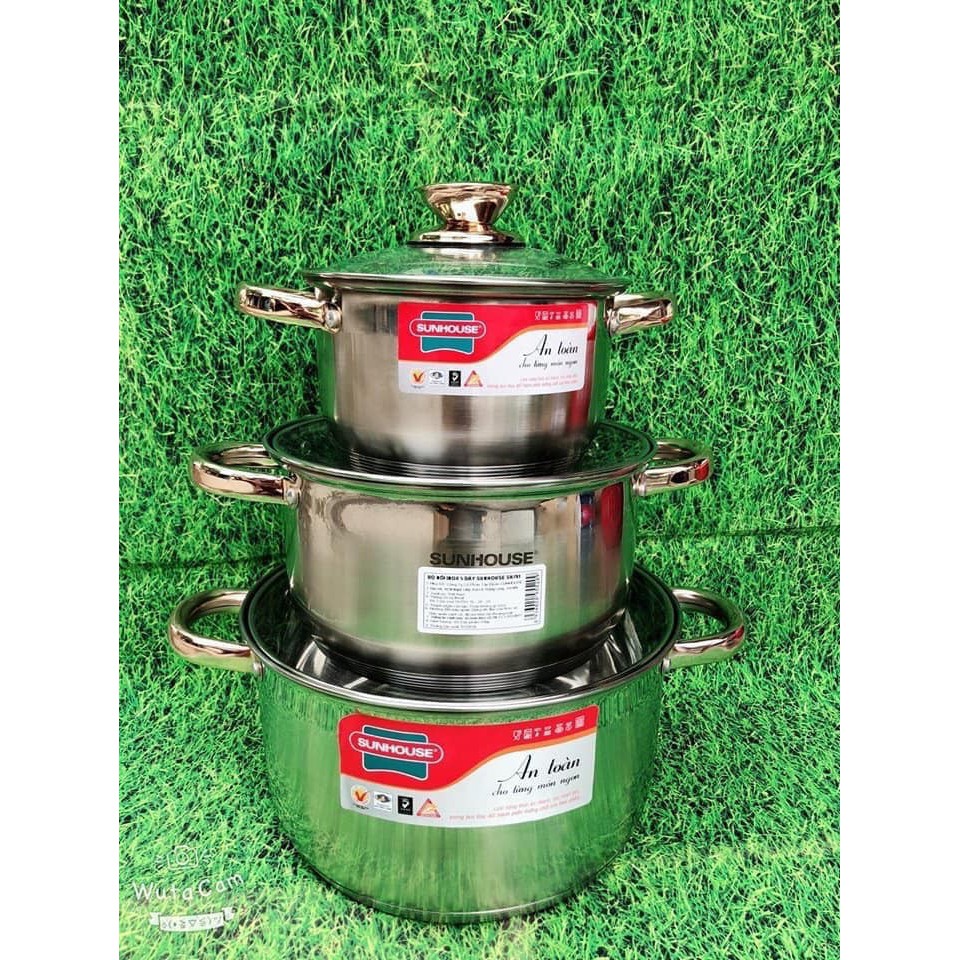 Bộ 3 nồi inox 5 đáy Sunhouse SH781 thương hiệu Sunhouse – Việt Nam, sản xuất tại Việt Nam. Thiết kế nồi inox sáng bóng, kiểu dáng tinh tế với tay cầm và núm nắp bằng inox bắt mắt, sang trọng.Chất liệu cao cấp