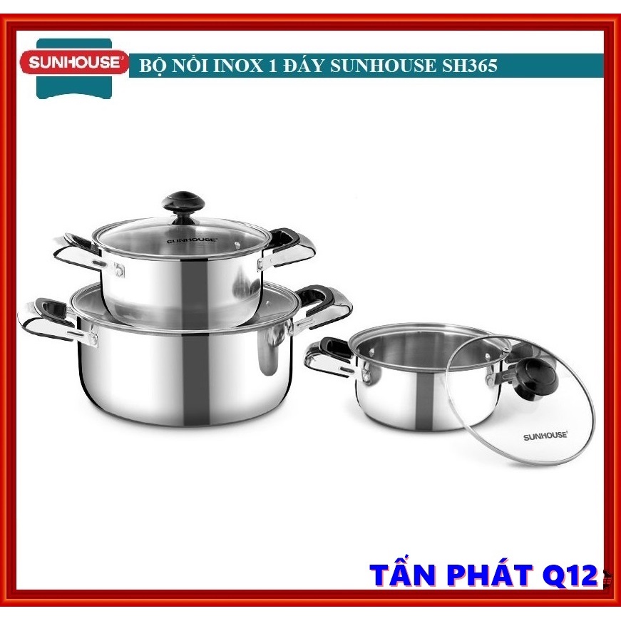 Bộ nồi inox 1 đáy SUNHOUSE SH365 được làm bằng chất liệu inox cao cấp, không bị oxy hóa, kiểu dáng đẹp mắt, quai núm bằng nhựa cách nhiệt. Bộ sản phẩm gồm 03 nồi với đường kính 16 - 18 - 24 cm đáp ứng tốt nhu cầu nấu nướng hàng ngày tại gia đình.