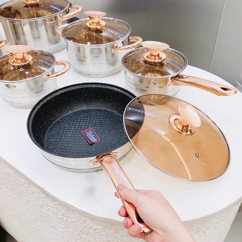 BỘ NỒI INOX VUNG KÍNH KAISAVILLA 6 MÓN 12 CHI TIẾT TAY CẦM TRÁNG MEN CHỐNG DÍNH MÃ KV-6618