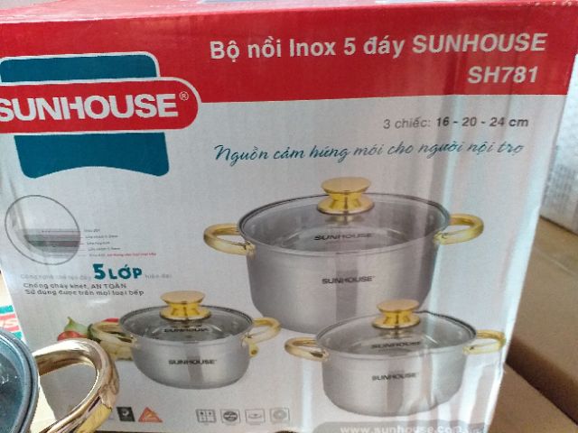 Bôn 3 cái nồi 5 đáy Sunhouse SH781 thương hiệu Sunhouse ,được sản xuất tại Việt Nam ,Nồi được thiết kế tinh sảo và sáng bóng