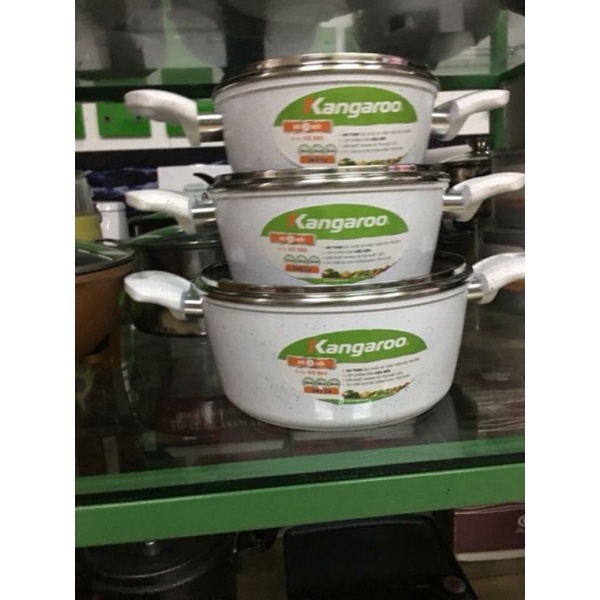 Bộ nồi nhôm Kangaroo KG995 gồm 3 kích thước khác nhau 18cm, 20cm, và 24cm, màu sắc trẻ trung, hiện đại khiến cho không gian bếp trở nên rực rỡ hơn.
