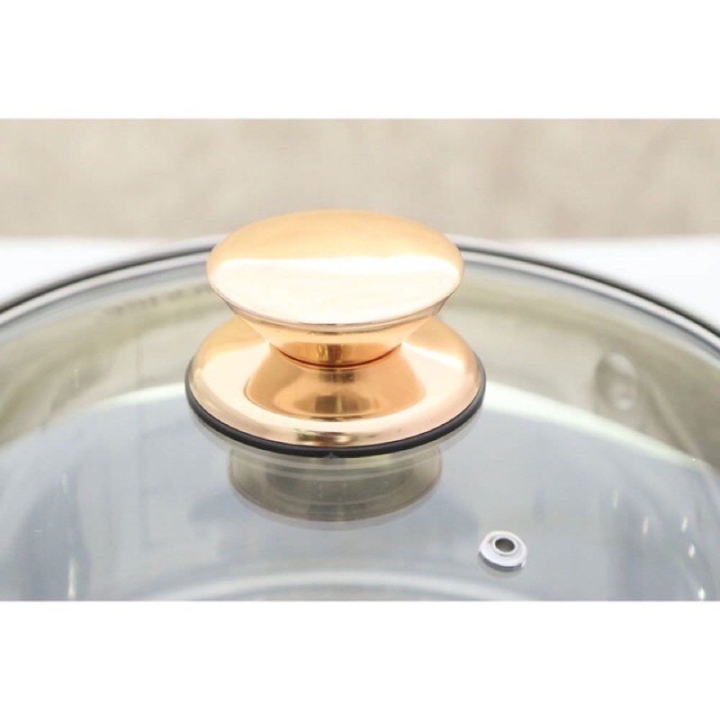 Quai nồi: inox mạ vàng sang trọng, tán đinh chắc chắn, chịu nhiệt, cách nhiệt tốt