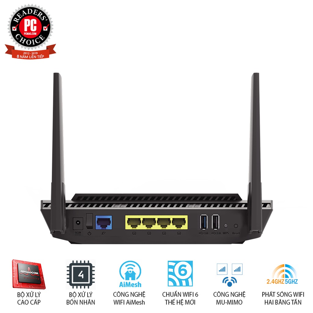 Router AX1800 Dual Band WiFi 6 (802.11ax) hỗ trợ công nghệ MU-MIMO và OFDMA, với bảo mật mạng AiProtection Pro do Trend Micro™ cung cấp, tương thích với hệ thống WiFi ASUS AiMeshChuẩn WiFi thế hệ tiếp theo - Hỗ trợ băng thông chuẩn Wi-Fi mới nhất 802.11AX (WiFi 6) và băng thông 80 MHz để có được dung lượng và hiệu quả tốt hơn