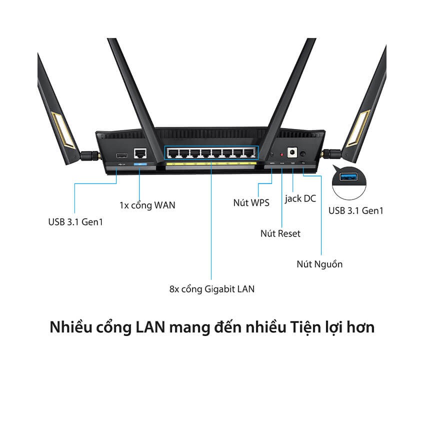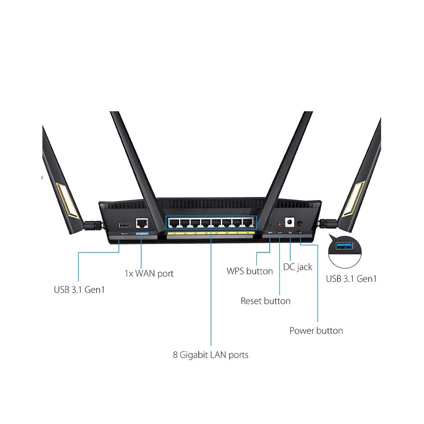 ASUS RT-AX88U (Gaming Router) Wifi AX6000 2 băng tần, Wifi 6 (802.11ax), AiMesh 360 WIFI Mesh, AiProtection, USB 3.1 2 băng tần chuẩn cho tổng tốc độ 6000Mbps (2.4Ghz:1148Mbps+ 5GHz: 4804Mbps), 4 ăng-ten rời 5dBi. Cổng: 8 port x 10/100/1000 Lan, 1x 10/100/1000 Wan, 2 x USb 3.1 Vi xử lý Quad-core 1.8Ghz, RAM 1GB, 256MB Flash