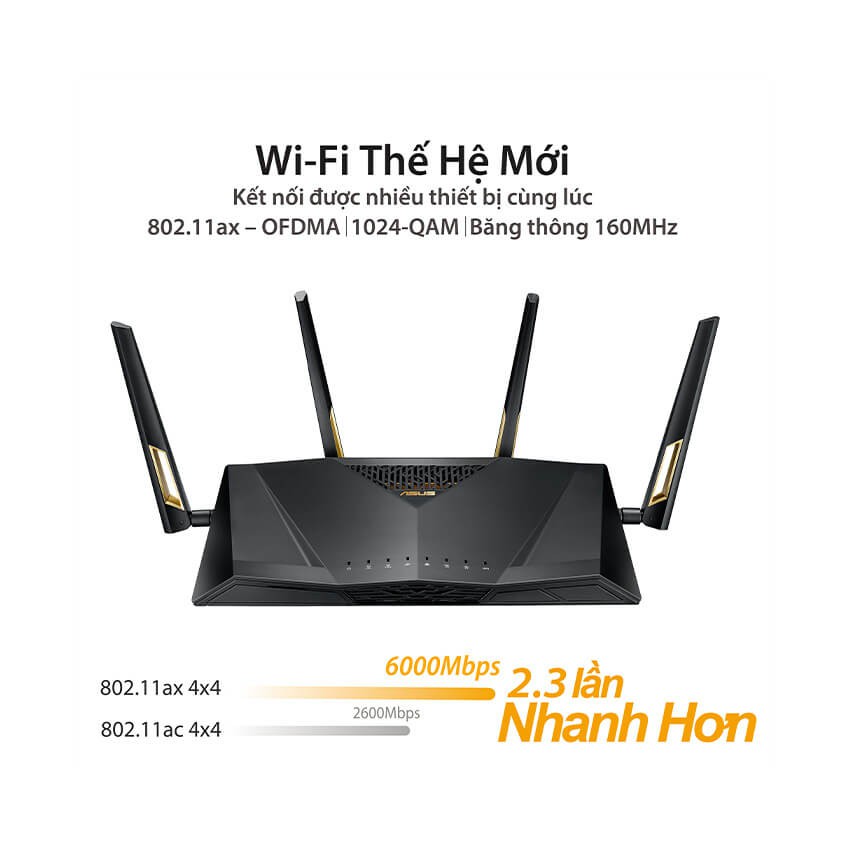 RT-AX88U là một định tuyến Wi-Fi băng tần kép 4x4 cho băng thông 160Mhz và 1024-QAM để kết nối không dây nhanh hơn đáng kể. Với tổng tốc độ mạng 6000Mbps — 1148Mbps trên băng tần 24,Ghz và 4804Mbps trên băng tần 5Ghz — RT-AX88U nhanh hơn các bộ định tuyến băng tần kép 4x4 802.11ac 2,3 lần.