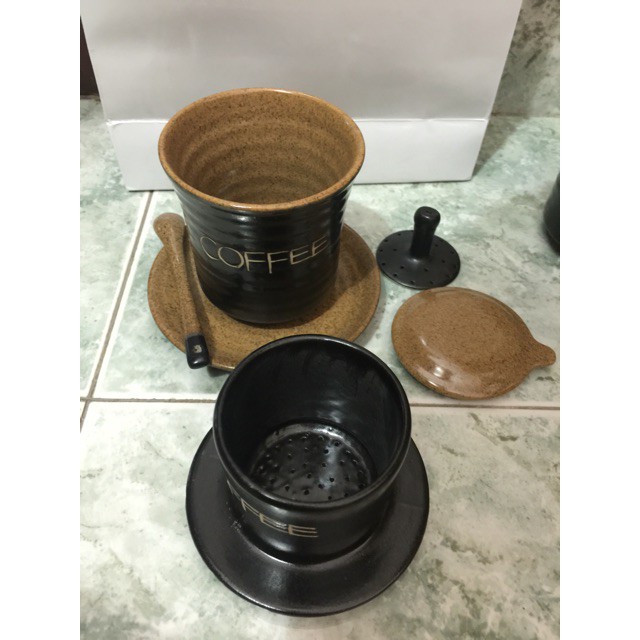 Bộ phin pha cà phê nâu gốm kèm muỗng sứ Gốm sứ Bát Tràng cao cấp khử chìThân cốc và phin khắc chữ " COFFEE "