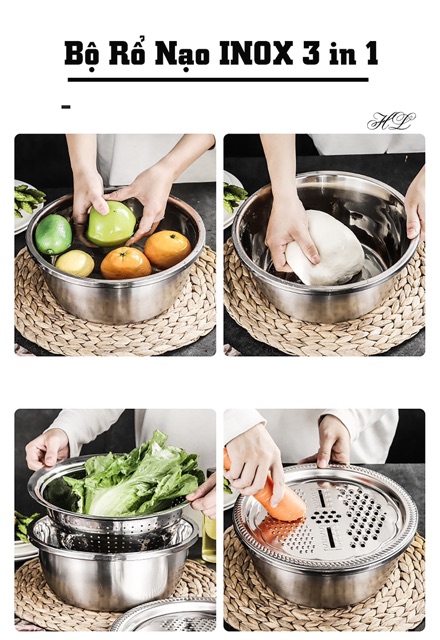 Bộ bao gồm : 01 Mặt nạo nhiều kiểu, 01 Rổ inox, 01 Chậu inox 100% cao cấp dày dặn