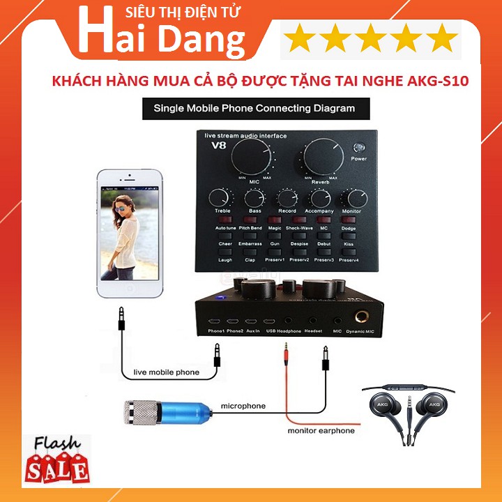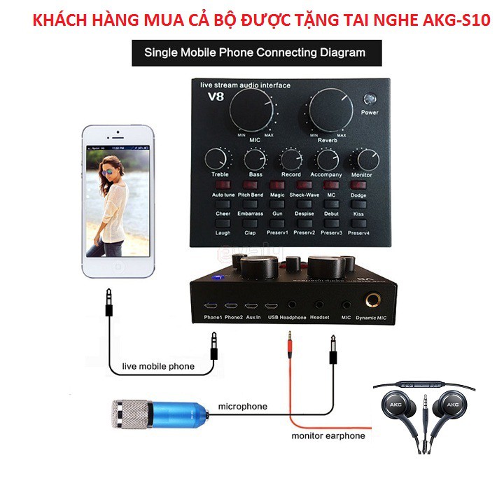 BỘ SOUND CARD V8, COMBO SOUND CARD V8 VÀ MIC BM900 HÁT KARAOKE LIVESTREAM TẶNG TAI NGHE AKG-S10 BẢO HÀNH 6 THÁNG