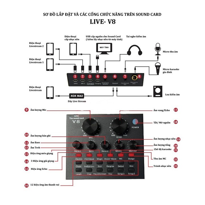 Sound card hiểu nôm na là “Card” Âm Thanh tức là thiết bị dùng để thu nhận, xử lý và phát tín hiệu âm thanh thông qua 1 thiết bị ngoại vi khác. Âm thanh trong máy tính là ở dạng digital (kỹ thuật số) muốn truyền tốt được ra ngoài cần có một thiết bị chuyển digital qua analog (tín hiệu băng tần) vậy nên Sound card thu âm V8 giúp máy bạn thực hiện điều đó. Sound card thu âm V8 là sản phẩm card âm thanh tương thích với nhiều thiết bị như smartphone, laptop, pc, máy tính bảng. Với tính năng làm méo giọng hát, thành giọng trẻ em, người già, Khả năng chèn các hiệu ứng âm thanh vào các đoạn thu như tiếng vỗ tay, tiếng hò reo, nhạc cổ vũ, tiếng chim kêu...