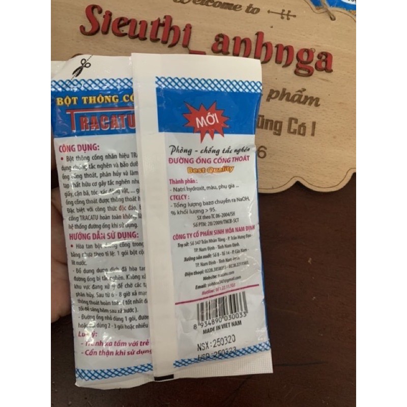 Bột thông cống Tracatu, thông tắc bồn cầu cực mạnh 100g hàng Việt Nam chất lượng1. Công dụng của bột thông cống tracatu Bột thông cống tracatu với công thức đặc biệt với các hoạt chất ăn mòn cực mạnh giúp thông tắc, chống tắc nghẽn và bảo dưỡng đường ống cống thoát, phân hủy và làm mềm các tạp chất hữu cơ gây tắc nghẽn như: rêu, rác, cặn bã, tóc, xác động vật…giúp đường ống cống thoát được thông thoáng hoàn toàn một cách nhanh nhất. Đặc biệt với công thức độc đáo, bột thông cống hoàn toàn không làm hư lại hệ thống đường ống khi sử dụng.2. Hướng dẫn sử dụng bột thông cống tracatu Đặc biệt: Khi trong đường ống nước vẫn chứa nước bạn chỉ cần đổ trực tiếp bột thông cống vào đường ống chờ vài tiếng đồng hồ rồi chờ bột thông cống phân hủy chất cặn bã rồi xả nước nhiều sẽ giúp thông thoát đường ống– Hòa tan bột thông cống tracatu trong dụng cụ bằng nhựa, sứ,…theo tỉ lệ 1 gói bột thông cống với 0,5 lít nước.– Đổ dung dịch đã hòa tan vào đầu đường ống bị tắc nghẽn. Không đổ nước vào khu vực đang xử lý để chờ các tạp chất bị phân hủy. Sau 6-8 giờ xả mạnh nước là là thông thoát hoàn toàn (tốt nhất đổ vào buổi tối để sáng hôm sau xả nước)– Đường ống nhỏ dùng 2 gói thuốc thông cống, đường ống lớn hoặc dài dùng 4-5 gói bột thông cống hoặc nhiều hơn.3. Lưu ý khi sử dụng bột thông cống tracatu+ Để bột thông cống tránh xa tầm với trẻ em.+ Cẩn thận khi sử dụng bột thông cống. (Lưu ý: Khi bị bột thông cống vướng vào tay, da người lập tức rửa sạch với nước sạch.) Với nhiều năng kinh nghiệm sản xuất và phân phối chế phẩn sinh học công ty chúng tôi cam đoan mang tới cho quý khách sản phẩm bột thông cống, men xử lý bể phốt tốt nhất trên thị trường hiện nay.Ngoài ra quý khách có thế tham khảo và tìm hiều thêm về dòng sản phẩm bột thông cống win mà công ty chúng tôi đang phân phối.xuất xứ việt nam