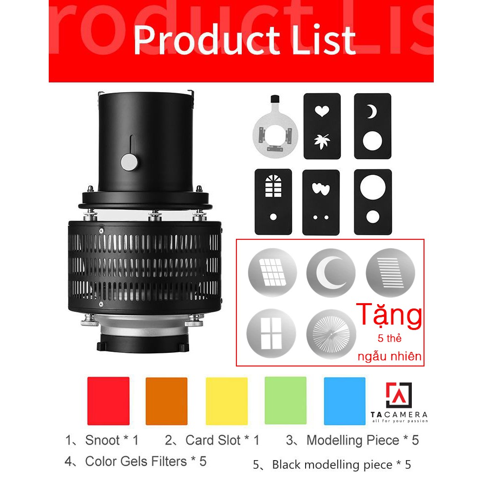 - Sản phẩm chính hãng Goldtpt, thấu kính trong hơn và rõ hơn so với hàng trôi nổi ko thương hiệu, kém chất lượng- Phụ kiện đi kèm: Spot (M-Optical Snoot), 5 tấm Filter màu, 5 Tấm mô hình, 1 Khay gắn