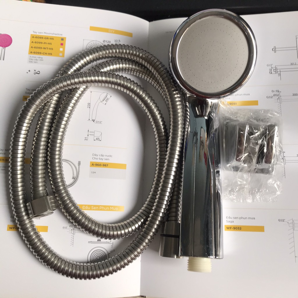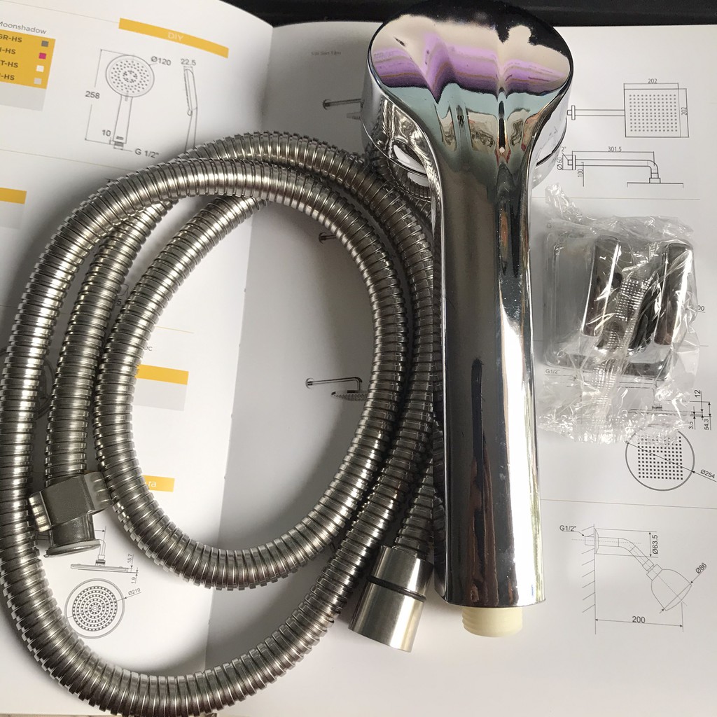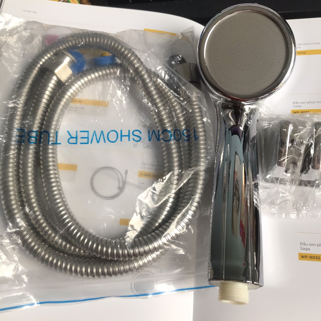 Bộ sản phẩm bao gồm : 1 đầu vòi hoa sen, 1 dây cấp nước 1.5m, 1 giá đỡ vòi hoa sen.