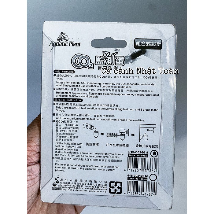 Bao gồm 1 lọ dung dịch thuốc thử, 1 dụng cụ thử nồng độ Co2 đặt trong hồ và bảng màu