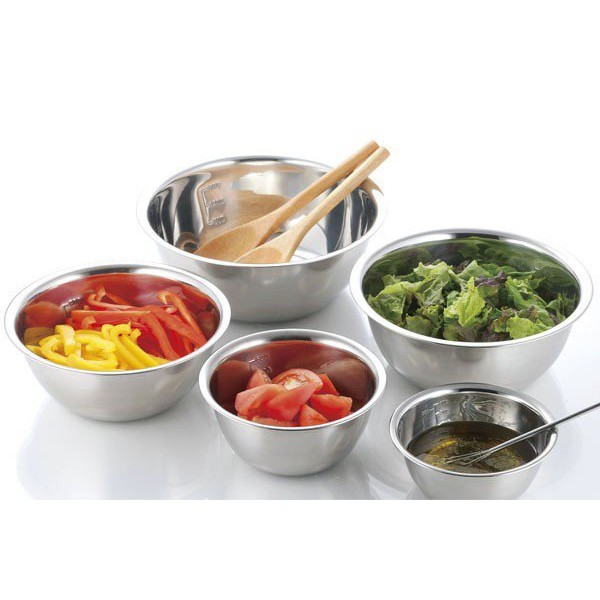 - Bộ gồm 4 tô và 1 rổ có kích thước và dung tích: 14cm – 580ml / 16cm – 900ml / 20cm – 1600ml / 22cm – 2050ml / 24cm – 2600ml