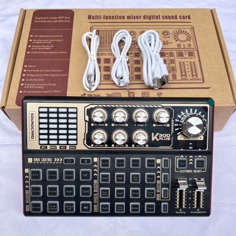 Các nút bấm và núm chỉnh của soundcard SK300 hoạt động hiệu quả và bền. Có các chức năng chỉnh tần số giọng, bass trable, âm lượng giọng, âm lượng nhạc nền… Ngoài ra còn có các núm chỉnh tiếng vang (giọng vang nhiều hay vang ít – echo) và các nút bấm chỉnh hiệu ứng giọng. Sound card SK300 có thể đổi giọng người dùng thành giọng trẻ con, giọng phụ nữ, ông già. Thích hợp cho việc live stream trên các nền tảng như facebook, tiktok, bigo…