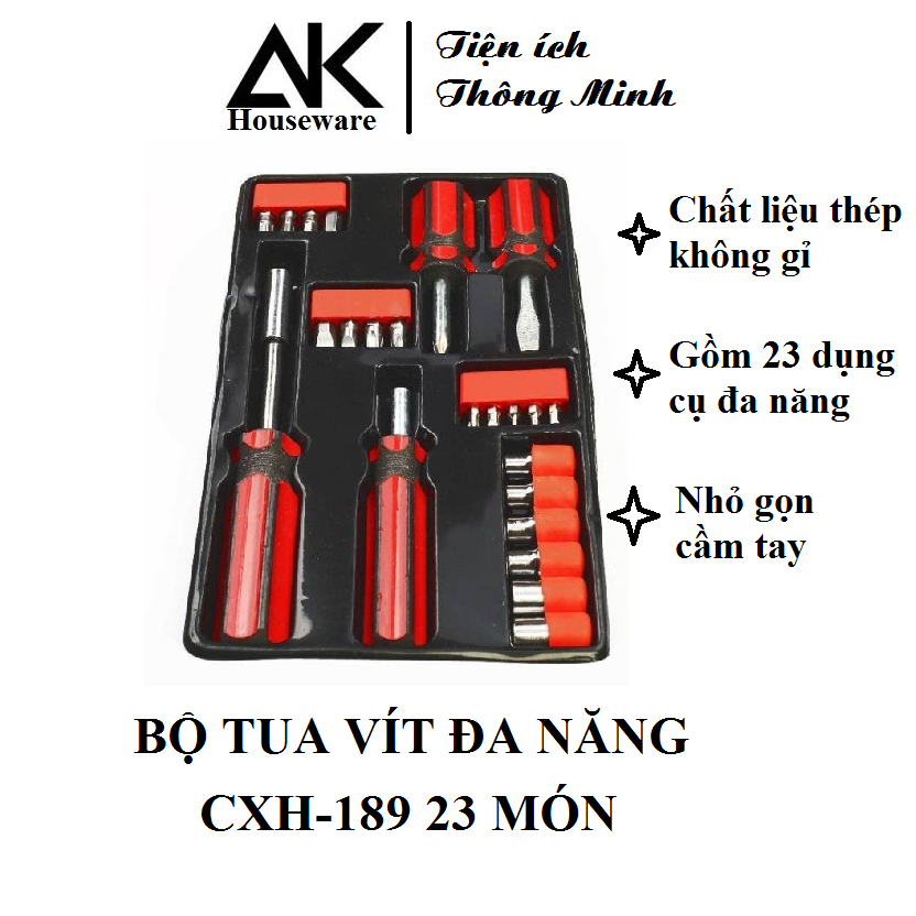 - Bộ vít đa năng CXH189 23 món chắc chắn sẽ là dụng cụ hỗ trợ đắc lực phục vụ các công việc của bạn được nhanh chóng và hiệu quả hơn rất nhiều.