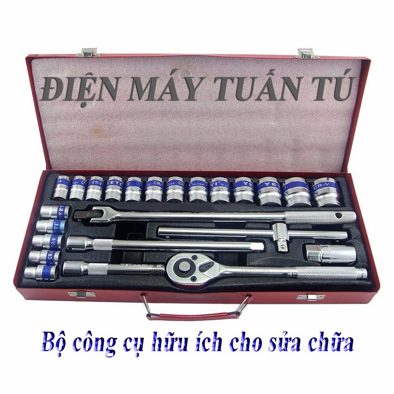 • Bộ tuýp gồm 18 đầu tuýp, 3 cần siết, 2 đầu nối, 1 đầu mở bugi và 1 hộp đựng.