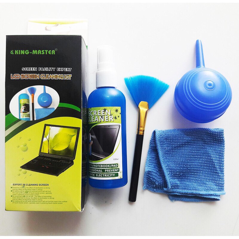 Bộ vệ sinh laptop King Master 4 món bao gồm 1 chổi quét, 1 thổi bụi, 1 chai dung dịch làm sạch và 1 miếng vải lau siêu thấm sẽ giúp nhanh chóng mang lại vẻ ngoài như mới cho chiếc laptop của bạn.