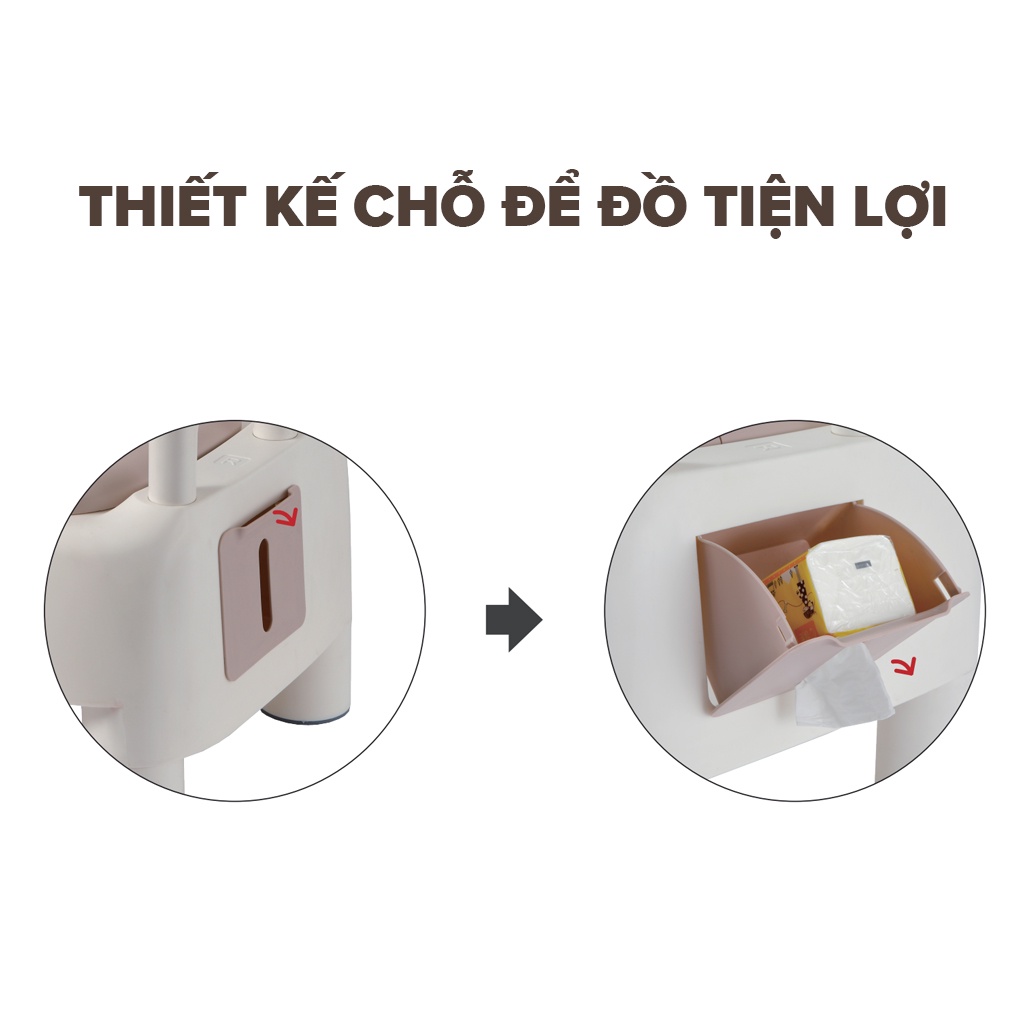 - Cạnh bô có thiết kế vị trí để đồ, giấy vệ sinh, ngăn để điện thoại thuận tiện.