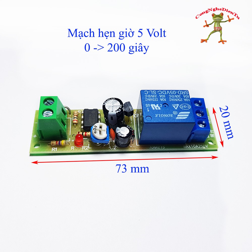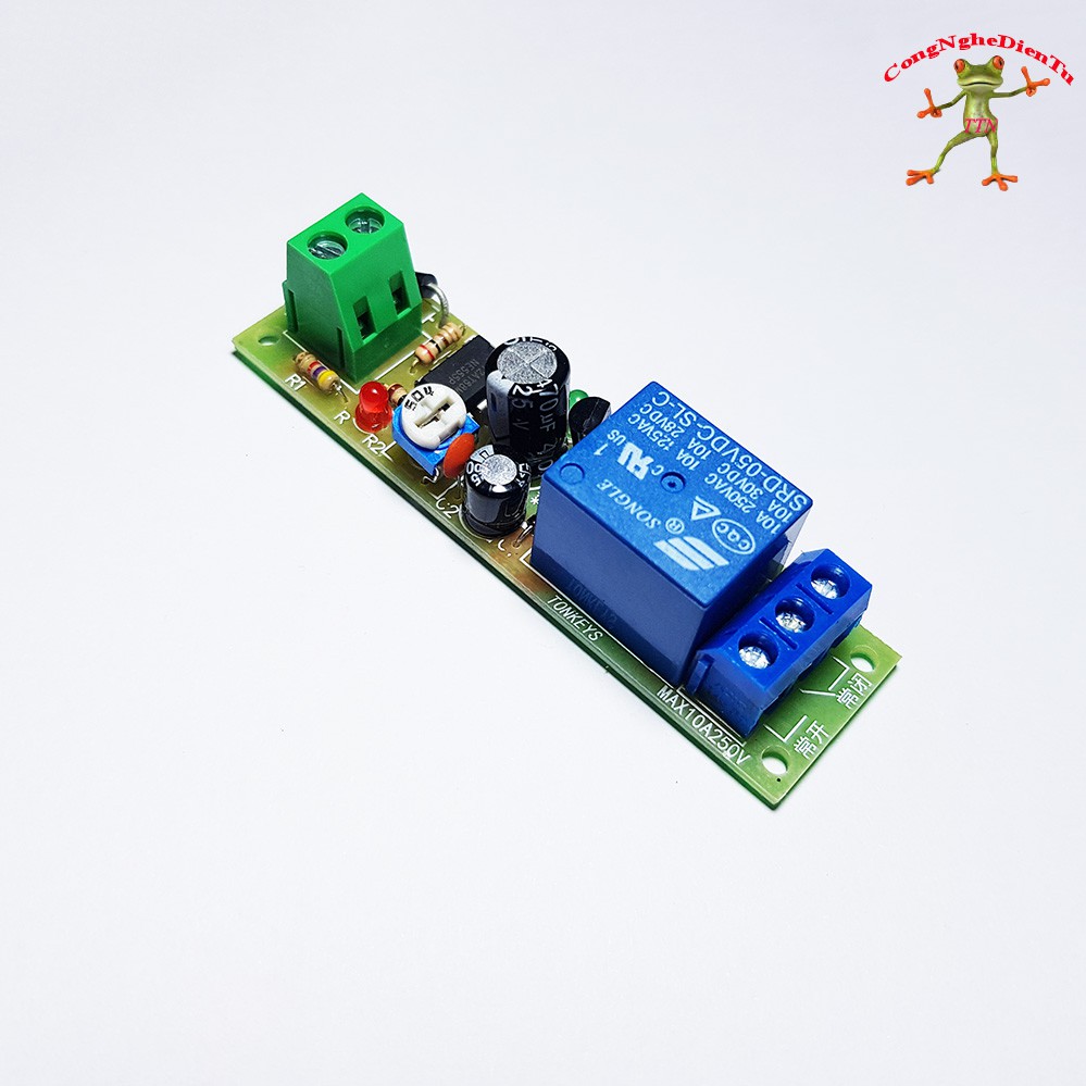 Thời gian trễ được thay đổi bởi một điện trở điều chỉnh. Thời gian trễ được điều chỉnh từ 0 đến 200 giây. (Có thể thay thế tụ để có thời gian lâu hơn )