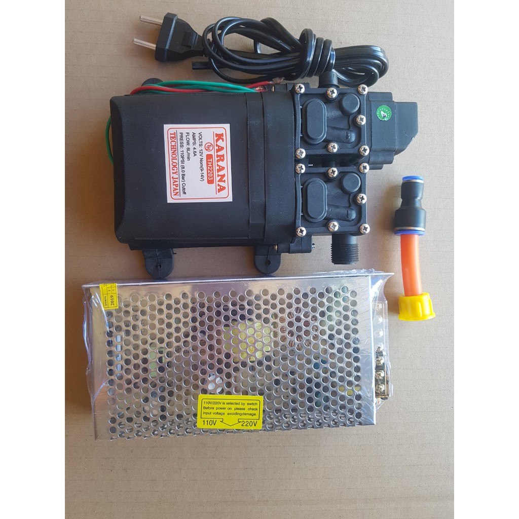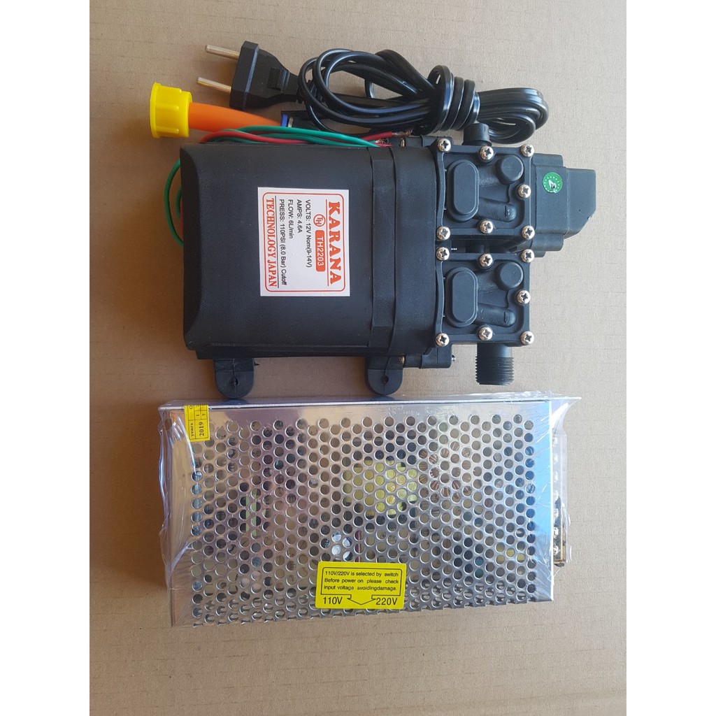 Bơm đôi tăng áp 12V KARANA kèm nguồn tổ ong 12V10A sử dụng 2 động cơ 775 cho áp lực gấp đôi tặng đuô chuyển ống 8li