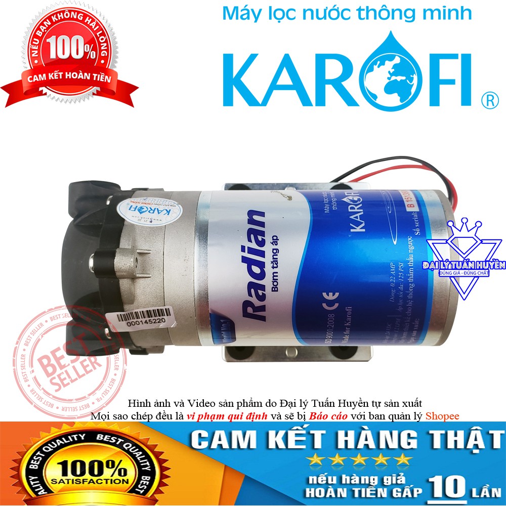 Bơm tăng áp Radian Karofi là sản phẩm được sản xuất độc quyền theo đơn đặt hàng của công ty Karofi Việt Nam. Trên đầu bơm có dòng chữ in nổi thương hiệu Karofi sắc nét, trên thân có tem bảo hành chính hãng Karofi. Bơm có độ bền cao, hút đẩy siêu khỏe. Sản phẩm Bơm tăng áp 24v Radian Karofi Chính hãng là sản phẩm tuyệt vời để lắp đặt cho các máy lọc nước RO hoặc giàn phun sương làm mát. Bơm được bảo hành lên đến 12 tháng bởi công ty Karofi Việt Nam.