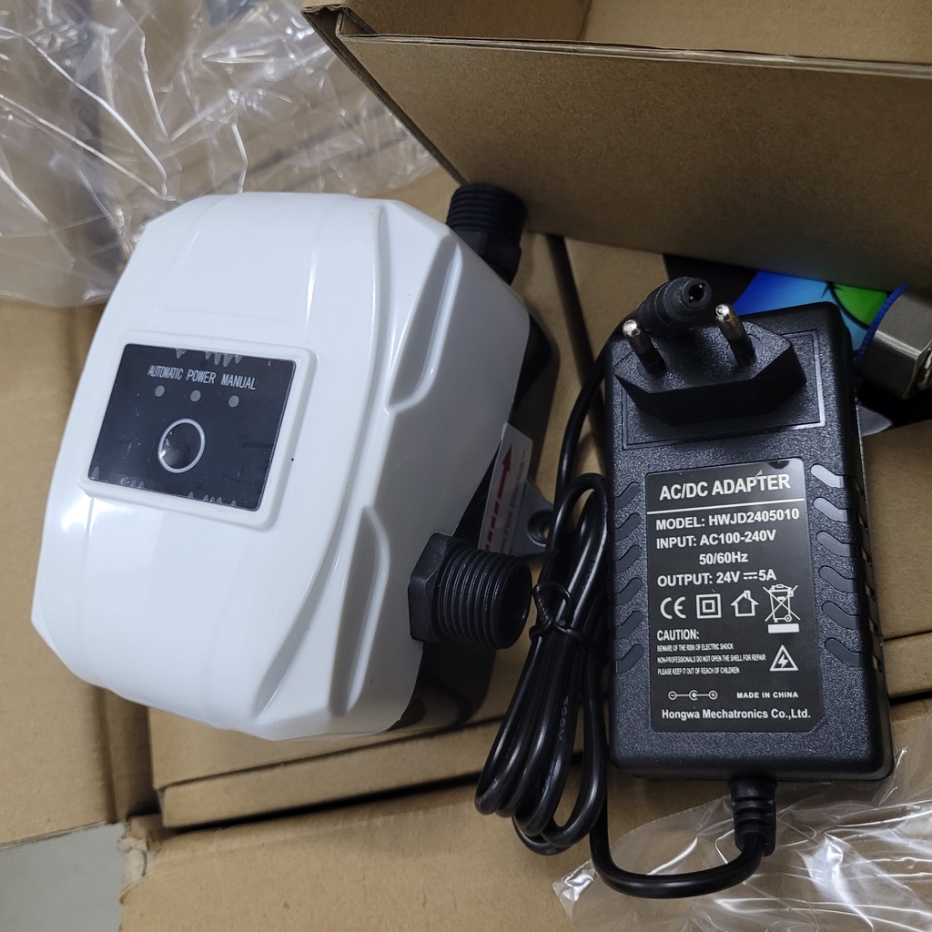Bộ sản phẩm gồm: 1 bơm tăng áp 24VDC, 01 adaptor 24V, 1 co 2 đầu ren trong 21mm