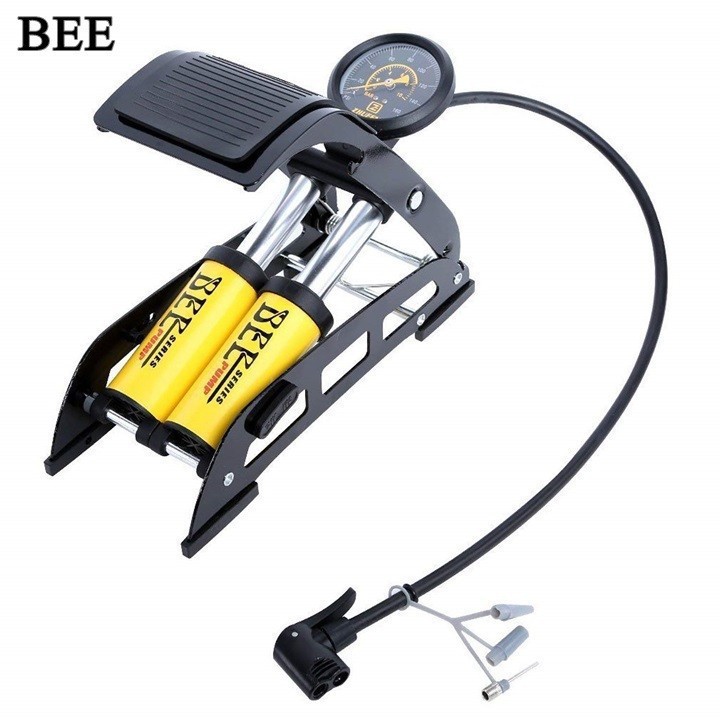 Bơm hơi xe 2 pittong BEE J44B-01 chính hãng còn có kèm theo vài loại van bơm. Có thể bơm lốp xe máy, xe đạp, bóng, xuồng, ca nô… rất tiện dụng