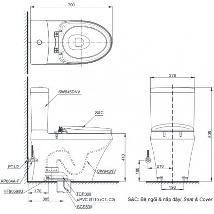 Bồn cầu TOTO 945 bao gồm 3 bộ phận