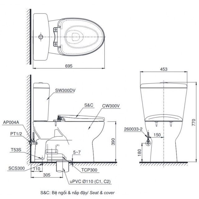 Giới thiệu Bồn Cầu Hai Khối TOTO CS300DT3Y1 Nắp TC385VS, bàn cầu 2 khối nắp đóng êm chính hãng