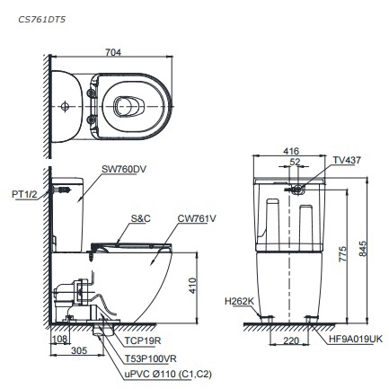 Tính năng bàn cầu TOTO CS761 thoát ngang