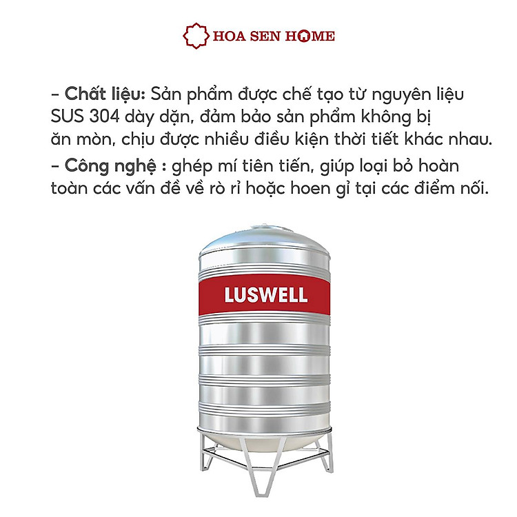 Giới thiệu Bộ bồn nước INOX LUSWELL VNDAI đứng dung tích 4000-5000L, chất liệu Inox SUS 304 bền bỉ, công nghệ ghép mí chống rò rỉ - Hoa Sen Home - Hàng chính hãng - MIỄN PHÍ VẬN CHUYỂN