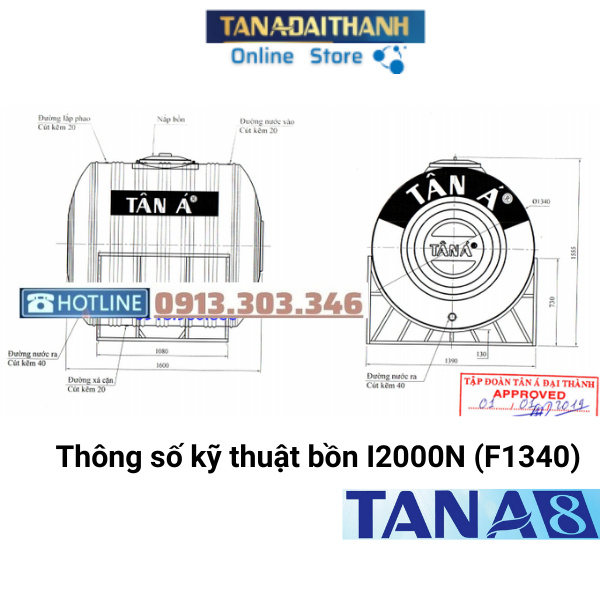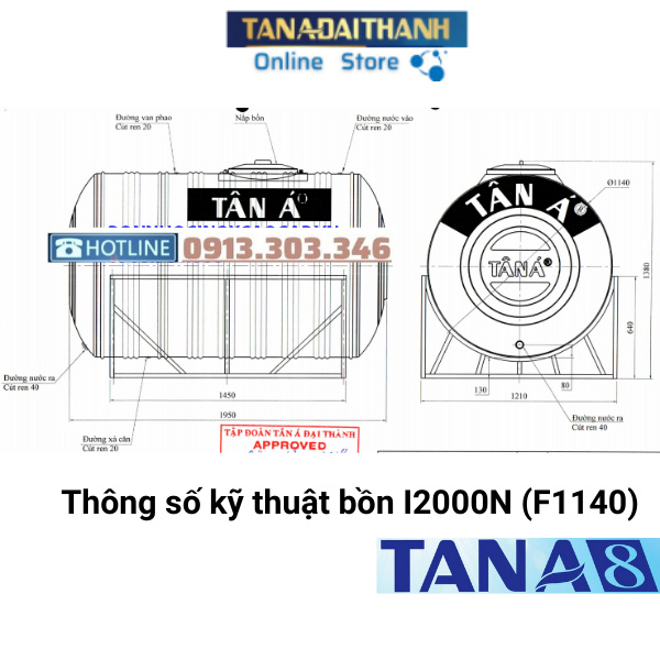 Giới thiệu Bồn Nước Inox Tân Á 8 Cao cấp Ngang 2000L (F1140 - F1340), bảo hành 15 năm, Tân Á Đại Thành online
