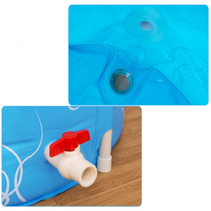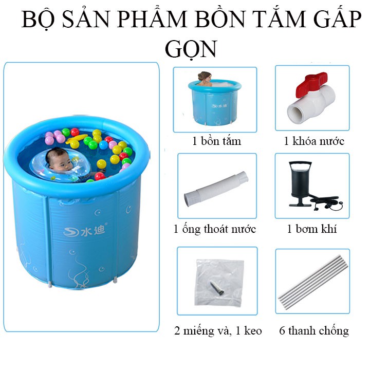 Bộ sản phầm gồm: 1 bồn tắm, 6 thanh sắt chắc chắn, 1 bơm khí, 1 vòi thoát nước, 1 vòi khóa nước, 1 keo dán và 2 miếng vá