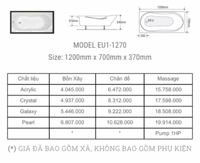 Tư vấn xin vui lòng ĐT/zal: 0986586043-Bồn tắm EU1- 1270- Chất liệu Acrylic, Crytal, Galaxy, Pearl đã bao gồm xả chưa bao gồm phụ kiện