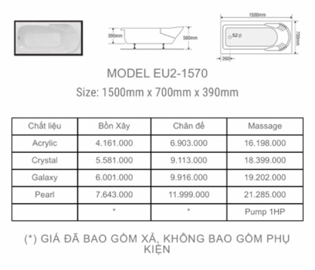Tư vấn xin vui lòng ĐT/zalo : 0986586043-Bồn tắm EU2- 1570- Chất liệu Acrylic, Crytal, Galaxy, Pearl đã bao gồm xả chưa bao gồm phụ kiện
