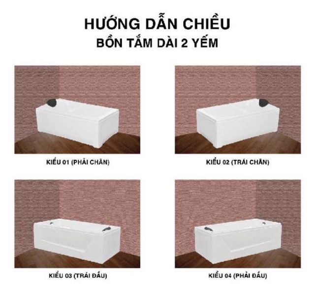 - Bồn xây và bồn chân yếm chưa bao gồm hệ thống vòi trên bồn. Chỉ có bồn Massage mới có hệ thống máy bơm, vòi Massage