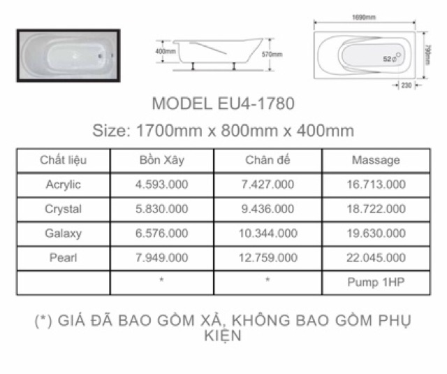 - Bồn xây và bồn chân yếm chưa bao gồm hệ thống vòi trên bồn. Chỉ có bồn Massage mới có hệ thống máy bơm, vòi Massage