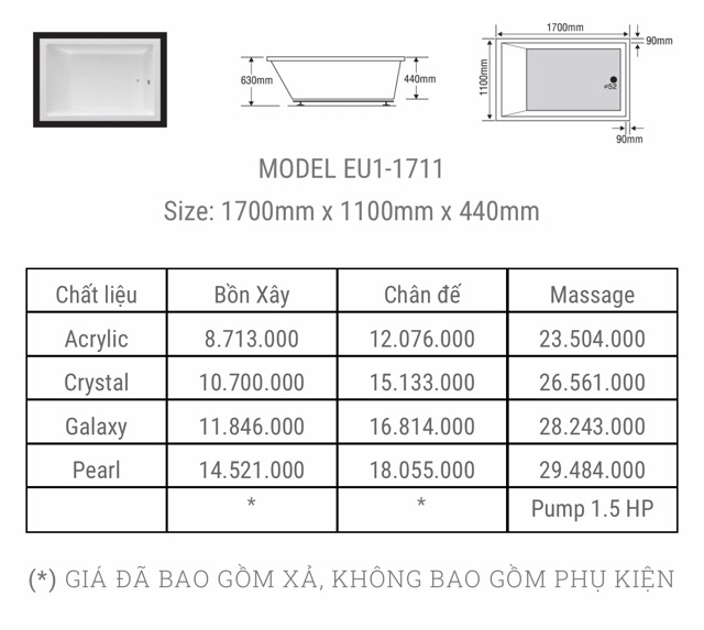 Tư vấn xin vui lòng ĐT/zalo : 0986586043-Bồn tắm EU1- 1711- Chất liệu Acrylic, Crytal, Galaxy, Pearl đã bao gồm xả chưa bao gồm phụ kiện