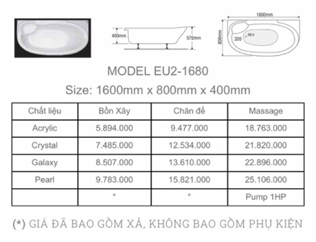 - Bồn xây và bồn chân yếm chưa bao gồm hệ thống vòi trên bồn. Chỉ có bồn Massage mới có hệ thống máy bơm, vòi Massage