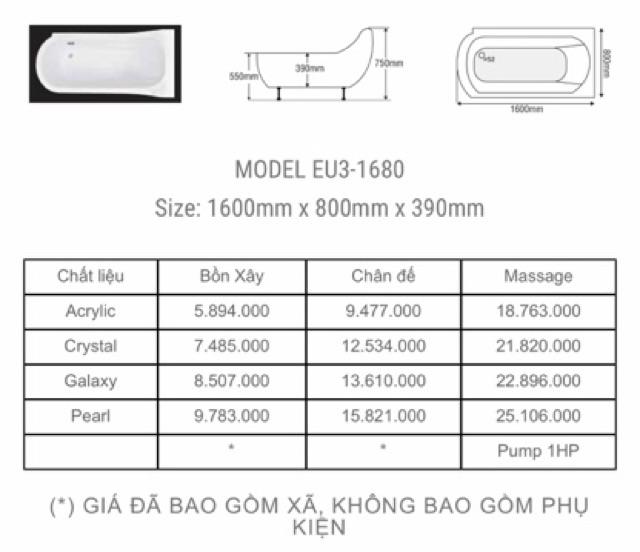 Tư vấn xin vui lòng ĐT/zalo : 0986586043-Bồn tắm EU3 - 1680 - Chất liệu Acrylic, Crytal, Galaxy, Pearl đã bao gồm xả chưa bao gồm phụ kiện