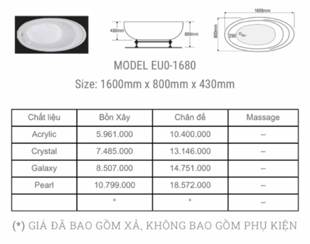 - Bồn xây và bồn chân yếm chưa bao gồm hệ thống vòi trên bồn. Chỉ có bồn Massage mới có hệ thống máy bơm, vòi Massage