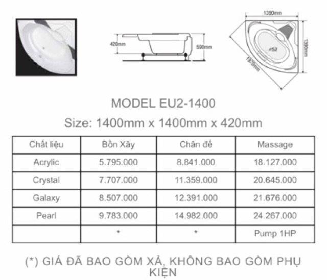 - Bồn xây và bồn chân yếm chưa bao gồm hệ thống vòi trên bồn. Chỉ có bồn Massage mới có hệ thống máy bơm, vòi Massage